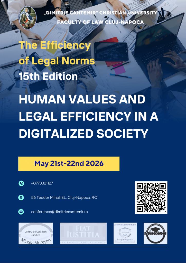 CONFERINȚA NAȚIONALĂ CU PARTICIPARE INTERNAȚIONALĂ “THE EFFICIENCY OF LEGAL NORMS” – ED. A XV-A 2026 Author admin Date & Time: May 21 - 22, 2026 10:00 am